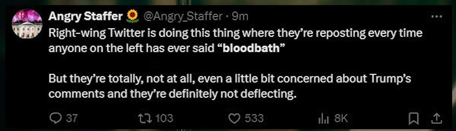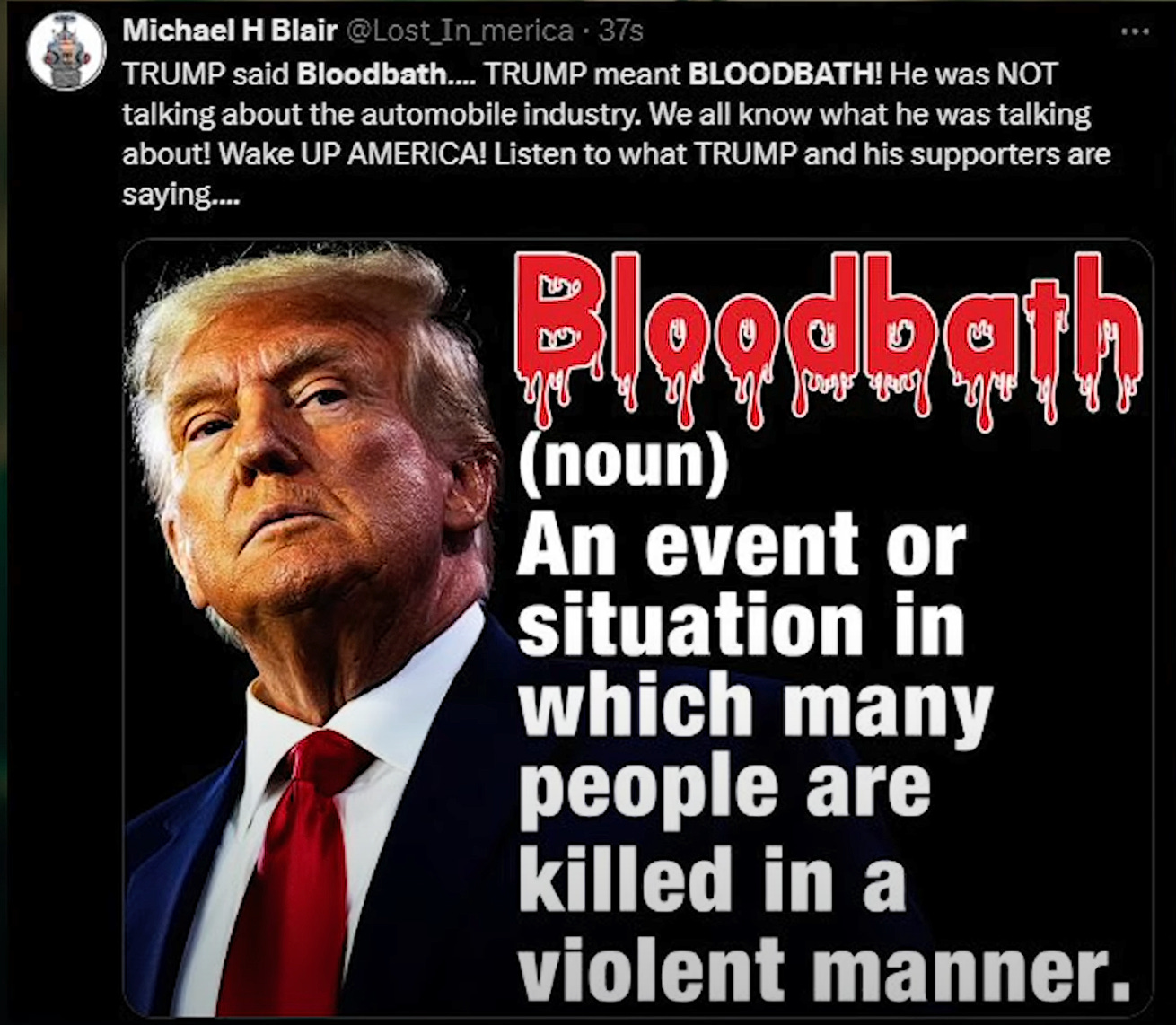 #bloodbath reclaimed by Trump supporters as counter-rhetoric; and supercuts of dems and leftists saying bloodbath over the last decade.