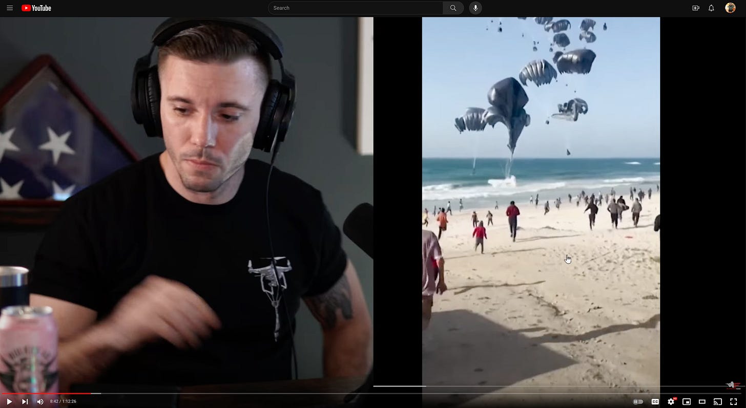 - Footage shows US airdrops of aid, comprising MREs, into Gaza.